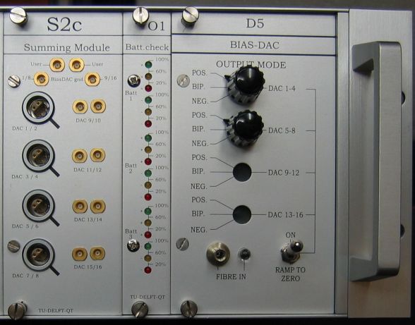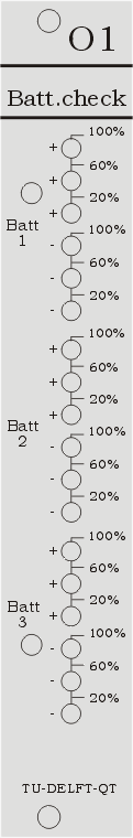 Battery check module O1 This (fixed) module shows permanently batterystatus for max 3 battery-units (=6 batteries). Each battery-unit has a dual 3-LED indicator indicating the charge of the two batteries by a green/yellow/red LED for: 100-60% 60-20% and below 20% remaining charge. Baterry operation time of an IVVIDAC-rack depends on number and type of source/measure modules used but is usually 3..6 days. Power consumption of this module is neglectible, by this module the battery would be discharged after 1.7 year of continuous operation. picture: O1 module in IVVIDACm-rack in between Summing module and DAC-module