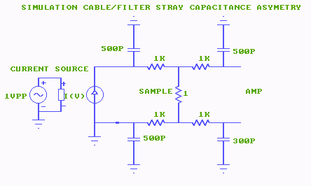 Wires to the sample have a capacitance to ground (shield) unequal capacitances can create a differential signal where there is actually no sample related signal present, Rsample = 0 ohm ![]() |