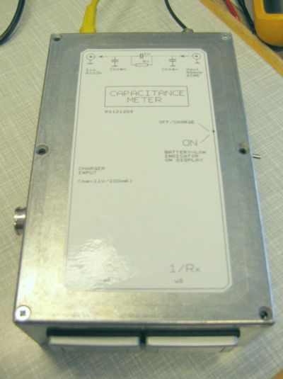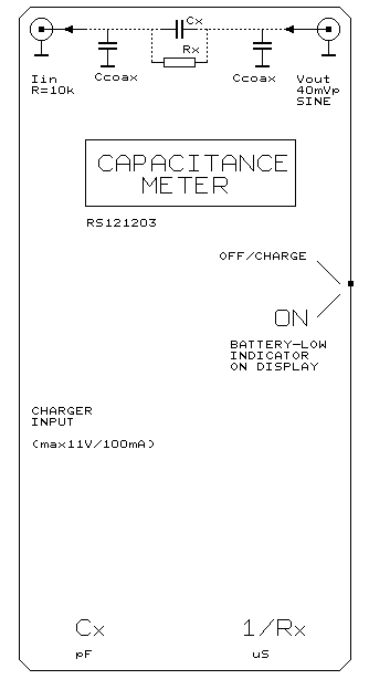 Capacitance (and conductance) meter Battery operated box using low signal levels (sinewave 40mVpeak approx 5kHz) that measures both capacitance and conductance (1/R). Both the output and input can be connected to a sample via several meters of coax without influencing the measured values. Only the capacitance from the inner pin of the output BNC to the inner pin of the input BNC is measured, using a phase-sensetive lockin technique suppressing interference and discriminating between the resistive(sine) and capacitive(cosine) current from the sample. Both results are shown on the two displays on the front of the box. | |